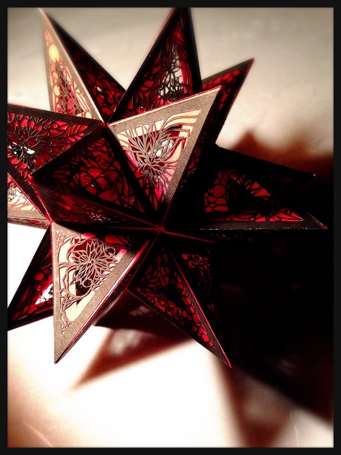 行灯の5面に切り絵を施してみました。灯りの中に浮き上がる切り絵を堪能して下されば幸いです。